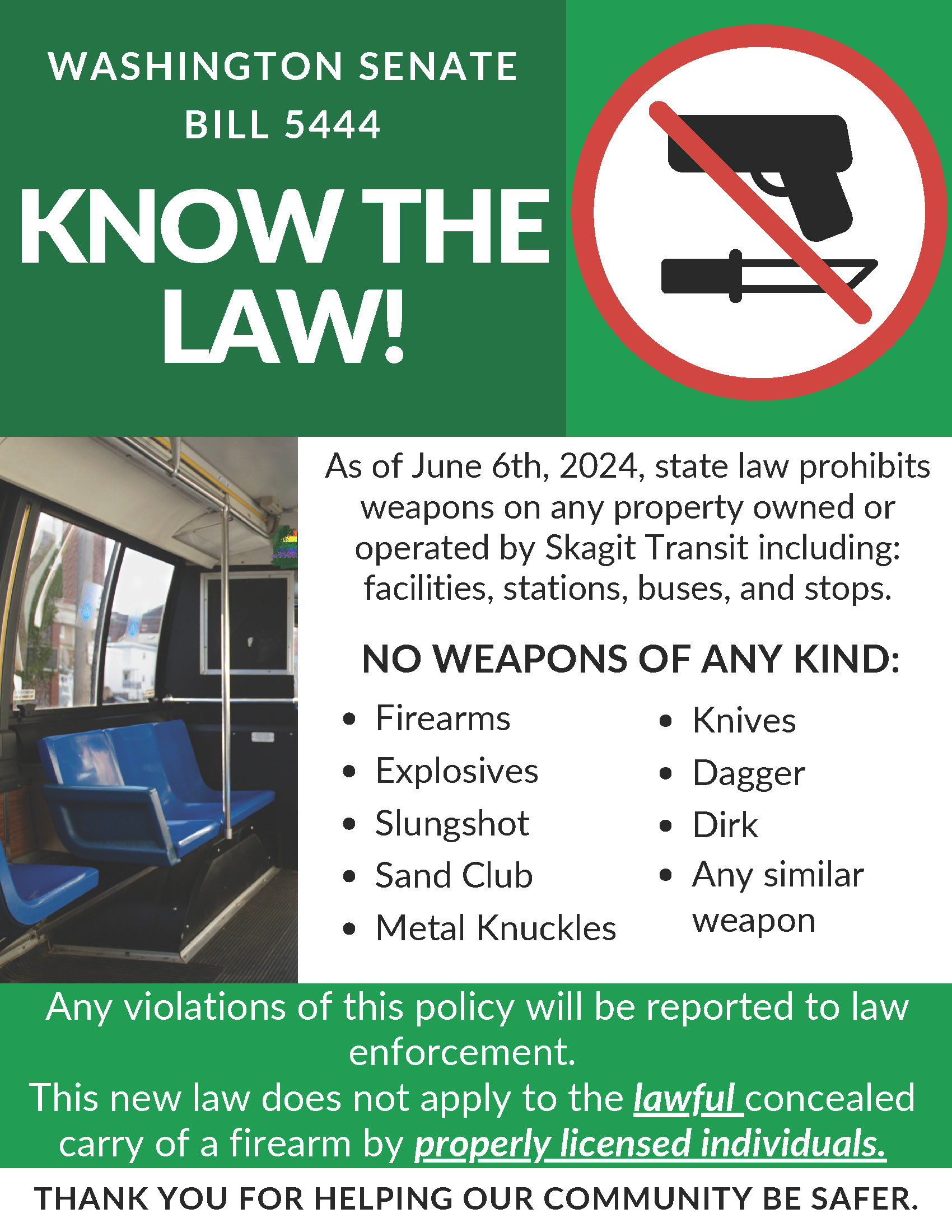 As of June 6th, 2024, state law prohibits weapons on any property owned or operated by Skagit Transit including: facilities, stations, buses, and stops.